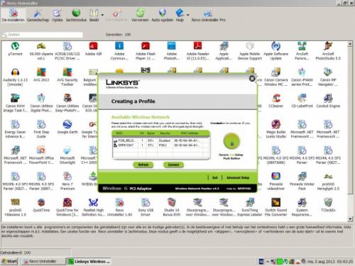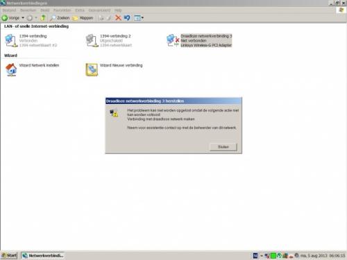 Zoals gemeld in mijn post werk ik met WEP,wat is het verschil met WAP?Hierbij de afb van Linksys monitor,de instelling van die kaart kan ik zonder probleem uit of instellen maar daarmee is hier het probleem nog niet opgelost.Het probleem is zowel op XP als W8.Met Belgacom is het een bbox 2 die ondertussen ook al 5j in gebruik is;is die misschien einde levensduur?Grtjs