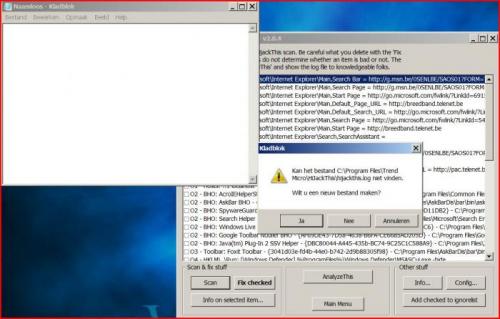 Hallo kweezie wabbit,ik heb het tweemaal geprobeerd maar die 2 items verdwijnen niet (er staat achteraan file missing) Logfile of Trend Micro HijackThis v2.0.4 Scan saved at 5:59:56, on 30/05/2011 Platform: Windows Vista SP2 (WinNT 6.00.1906) MSIE: Internet Explorer v9.00 (9.00.8112.16421) Boot mode: Normal Running processes: C:\Windows\system32\Dwm.exe C:\Windows\Explorer.EXE C:\Windows\system32\taskeng.exe C:\Program Files\Windows Defender\MSASCui.exe C:\Program Files\Alwil Software\Avast5\AvastUI.exe C:\Program Files\Common Files\Java\Java Update\jusched.exe C:\Windows\ehome\ehtray.exe C:\Program Files\SpywareGuard\sgmain.exe C:\Windows\System32\mobsync.exe C:\Windows\ehome\ehmsas.exe C:\Program Files\Windows Media Player\wmpnscfg.exe C:\Windows\system32\wbem\unsecapp.exe C:\Program Files\SpywareGuard\sgbhp.exe C:\Users\Leo\Downloads\HijackThis.exe R1 - HKCU\Software\Microsoft\Internet Explorer\Main,Search Bar = Bing R1 - HKCU\Software\Microsoft\Internet Explorer\Main,Search Page = Bing R0 - HKCU\Software\Microsoft\Internet Explorer\Main,Start Page = Hotmail, Messenger, nieuws en entertainment vind je op MSN.nl R1 - HKLM\Software\Microsoft\Internet Explorer\Main,Default_Page_URL = Zita - het Web van Z tot A - Nieuws | Entertainment | Lifestyle | Fun R1 - HKLM\Software\Microsoft\Internet Explorer\Main,Default_Search_URL = Bing R1 - HKLM\Software\Microsoft\Internet Explorer\Main,Search Page = Bing R0 - HKLM\Software\Microsoft\Internet Explorer\Main,Start Page = Zita - het Web van Z tot A - Nieuws | Entertainment | Lifestyle | Fun R0 - HKLM\Software\Microsoft\Internet Explorer\Search,SearchAssistant = R0 - HKLM\Software\Microsoft\Internet Explorer\Search,CustomizeSearch = R1 - HKCU\Software\Microsoft\Internet Explorer\SearchURL,(Default) = Bing R1 - HKCU\Software\Microsoft\Internet Explorer\Main,Window Title = Telenet Internet R1 - HKCU\Software\Microsoft\Windows\CurrentVersion\Internet Settings,AutoConfigURL = http://pac.telenet.be:8080/ O1 - Hosts: ::1 localhost O2 - BHO: AcroIEHelperStub - {18DF081C-E8AD-4283-A596-FA578C2EBDC3} - C:\Program Files\Common Files\Adobe\Acrobat\ActiveX\AcroIEHelperShim.dll O2 - BHO: AskBar BHO - {201f27d4-3704-41d6-89c1-aa35e39143ed} - C:\Program Files\AskBarDis\bar\bin\askBar.dll (file missing) O2 - BHO: SpywareGuard Download Protection - {4A368E80-174F-4872-96B5-0B27DDD11DB2} - C:\Program Files\SpywareGuard\dlprotect.dll O2 - BHO: Search Helper - {6EBF7485-159F-4bff-A14F-B9E3AAC4465B} - C:\Program Files\Microsoft\Search Enhancement Pack\Search Helper\SEPsearchhelperie.dll O2 - BHO: Windows Live ID Sign-in Helper - {9030D464-4C02-4ABF-8ECC-5164760863C6} - C:\Program Files\Common Files\Microsoft Shared\Windows Live\WindowsLiveLogin.dll O2 - BHO: Google Toolbar Notifier BHO - {AF69DE43-7D58-4638-B6FA-CE66B5AD205D} - C:\Program Files\Google\GoogleToolbarNotifier\5.0.926.3450\swg.dll O2 - BHO: Java Plug-In 2 SSV Helper - {DBC80044-A445-435b-BC74-9C25C1C588A9} - C:\Program Files\Java\jre6\bin\jp2ssv.dll O3 - Toolbar: Foxit Toolbar - {3041d03e-fd4b-44e0-b742-2d9b88305f98} - C:\Program Files\AskBarDis\bar\bin\askBar.dll (file missing) O4 - HKLM\..\Run: [Windows Defender] %ProgramFiles%\Windows Defender\MSASCui.exe -hide O4 - HKLM\..\Run: [sysTrayApp] %ProgramFiles%\IDT\WDM\sttray.exe O4 - HKLM\..\Run: [avast5] "C:\Program Files\Alwil Software\Avast5\avastUI.exe" /nogui O4 - HKLM\..\Run: [sunJavaUpdateSched] "C:\Program Files\Common Files\Java\Java Update\jusched.exe" O4 - HKLM\..\Run: [Adobe Reader Speed Launcher] "C:\Program Files\Adobe\Reader 9.0\Reader\Reader_sl.exe" O4 - HKCU\..\Run: [ehTray.exe] C:\Windows\ehome\ehTray.exe O4 - Startup: SpywareGuard.lnk = C:\Program Files\SpywareGuard\sgmain.exe O8 - Extra context menu item: Add to Google Photos Screensa&ver - res://C:\Windows\system32\GPhotos.scr/200 O8 - Extra context menu item: Afbeelding verzenden naar &Bluetooth-apparaat... - C:\Program Files\ANYCOM\Blue USB-200-250\btsendto_ie_ctx.htm O8 - Extra context menu item: E&xporteren naar Microsoft Excel - res://C:\PROGRA~1\MICROS~2\Office12\EXCEL.EXE/3000 O8 - Extra context menu item: Pagina verzenden naar &Bluetooth-apparaat... - C:\Program Files\ANYCOM\Blue USB-200-250\btsendto_ie.htm O9 - Extra button: @C:\Program Files\Windows Live\Writer\WindowsLiveWriterShortcuts.dll,-1004 - {219C3416-8CB2-491a-A3C7-D9FCDDC9D600} - C:\Program Files\Windows Live\Writer\WriterBrowserExtension.dll O9 - Extra 'Tools' menuitem: @C:\Program Files\Windows Live\Writer\WindowsLiveWriterShortcuts.dll,-1003 - {219C3416-8CB2-491a-A3C7-D9FCDDC9D600} - C:\Program Files\Windows Live\Writer\WriterBrowserExtension.dll O9 - Extra button: Verzenden naar OneNote - {2670000A-7350-4f3c-8081-5663EE0C6C49} - C:\PROGRA~1\MICROS~2\Office12\ONBttnIE.dll O9 - Extra 'Tools' menuitem: Verz&enden naar OneNote - {2670000A-7350-4f3c-8081-5663EE0C6C49} - C:\PROGRA~1\MICROS~2\Office12\ONBttnIE.dll O9 - Extra button: Research - {92780B25-18CC-41C8-B9BE-3C9C571A8263} - C:\PROGRA~1\MICROS~2\Office12\REFIEBAR.DLL O9 - Extra button: @btrez.dll,-4015 - {CCA281CA-C863-46ef-9331-5C8D4460577F} - C:\Program Files\ANYCOM\Blue USB-200-250\btsendto_ie.htm O9 - Extra 'Tools' menuitem: @btrez.dll,-12650 - {CCA281CA-C863-46ef-9331-5C8D4460577F} - C:\Program Files\ANYCOM\Blue USB-200-250\btsendto_ie.htm O11 - Options group: [ACCELERATED_GRAPHICS] Accelerated graphics O16 - DPF: {D27CDB6E-AE6D-11CF-96B8-444553540000} (Shockwave Flash Object) - http://fpdownload2.macromedia.com/get/shockwave/cabs/flash/swflash.cab O18 - Protocol: wlpg - {E43EF6CD-A37A-4A9B-9E6F-83F89B8E6324} - C:\Program Files\Windows Live\Photo Gallery\AlbumDownloadProtocolHandler.dll O22 - SharedTaskScheduler: Component Categories cache daemon - {8C7461EF-2B13-11d2-BE35-3078302C2030} - C:\Windows\system32\browseui.dll O23 - Service: avast! Antivirus - AVAST Software - C:\Program Files\Alwil Software\Avast5\AvastSvc.exe O23 - Service: NVIDIA Display Driver Service (nvsvc) - NVIDIA Corporation - C:\Windows\system32\nvvsvc.exe O23 - Service: ServiceLayer -