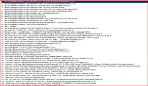 Hallo kweezie wabbit,het is gelukt op die manier,ben echt benieuwd wat daar gaat uit komen,alvast bedankt. Logfile of Trend Micro HijackThis v2.0.4 Scan saved at 14:26:02, on 29/05/2011 Platform: Windows Vista SP2 (WinNT 6.00.1906) MSIE: Internet Explorer v9.00 (9.00.8112.16421) Boot mode: Normal Running processes: C:\Windows\system32\Dwm.exe C:\Windows\system32\taskeng.exe C:\Windows\Explorer.EXE C:\Program Files\Windows Defender\MSASCui.exe C:\Program Files\Alwil Software\Avast5\AvastUI.exe C:\Program Files\Common Files\Java\Java Update\jusched.exe C:\Windows\ehome\ehtray.exe C:\Windows\ehome\ehmsas.exe C:\Program Files\SpywareGuard\sgmain.exe C:\Program Files\SpywareGuard\sgbhp.exe C:\Program Files\Windows Media Player\wmpnscfg.exe C:\Windows\system32\wbem\unsecapp.exe C:\Users\Leo\Downloads\HijackThis.exe R1 - HKCU\Software\Microsoft\Internet Explorer\Main,Search Bar = Bing R1 - HKCU\Software\Microsoft\Internet Explorer\Main,Search Page = Bing R0 - HKCU\Software\Microsoft\Internet Explorer\Main,Start Page = Hotmail, Messenger, nieuws en entertainment vind je op MSN.nl R1 - HKLM\Software\Microsoft\Internet Explorer\Main,Default_Page_URL = Zita - het Web van Z tot A - Nieuws | Entertainment | Lifestyle | Fun R1 - HKLM\Software\Microsoft\Internet Explorer\Main,Default_Search_URL = Bing R1 - HKLM\Software\Microsoft\Internet Explorer\Main,Search Page = Bing R0 - HKLM\Software\Microsoft\Internet Explorer\Main,Start Page = Zita - het Web van Z tot A - Nieuws | Entertainment | Lifestyle | Fun R0 - HKLM\Software\Microsoft\Internet Explorer\Search,SearchAssistant = R0 - HKLM\Software\Microsoft\Internet Explorer\Search,CustomizeSearch = R1 - HKCU\Software\Microsoft\Internet Explorer\SearchURL,(Default) = Bing R1 - HKCU\Software\Microsoft\Internet Explorer\Main,Window Title = Telenet Internet R1 - HKCU\Software\Microsoft\Windows\CurrentVersion\Internet Settings,AutoConfigURL = http://pac.telenet.be:8080/ R0 - HKCU\Software\Microsoft\Internet Explorer\Toolbar,LinksFolderName = O1 - Hosts: ::1 localhost O2 - BHO: AcroIEHelperStub - {18DF081C-E8AD-4283-A596-FA578C2EBDC3} - C:\Program Files\Common Files\Adobe\Acrobat\ActiveX\AcroIEHelperShim.dll O2 - BHO: AskBar BHO - {201f27d4-3704-41d6-89c1-aa35e39143ed} - C:\Program Files\AskBarDis\bar\bin\askBar.dll O2 - BHO: SpywareGuard Download Protection - {4A368E80-174F-4872-96B5-0B27DDD11DB2} - C:\Program Files\SpywareGuard\dlprotect.dll O2 - BHO: Search Helper - {6EBF7485-159F-4bff-A14F-B9E3AAC4465B} - C:\Program Files\Microsoft\Search Enhancement Pack\Search Helper\SEPsearchhelperie.dll O2 - BHO: Windows Live ID Sign-in Helper - {9030D464-4C02-4ABF-8ECC-5164760863C6} - C:\Program Files\Common Files\Microsoft Shared\Windows Live\WindowsLiveLogin.dll O2 - BHO: Google Toolbar Notifier BHO - {AF69DE43-7D58-4638-B6FA-CE66B5AD205D} - C:\Program Files\Google\GoogleToolbarNotifier\5.0.926.3450\swg.dll O2 - BHO: Java Plug-In 2 SSV Helper - {DBC80044-A445-435b-BC74-9C25C1C588A9} - C:\Program Files\Java\jre6\bin\jp2ssv.dll O3 - Toolbar: Foxit Toolbar - {3041d03e-fd4b-44e0-b742-2d9b88305f98} - C:\Program Files\AskBarDis\bar\bin\askBar.dll O4 - HKLM\..\Run: [Windows Defender] %ProgramFiles%\Windows Defender\MSASCui.exe -hide O4 - HKLM\..\Run: [sysTrayApp] %ProgramFiles%\IDT\WDM\sttray.exe O4 - HKLM\..\Run: [avast5] "C:\Program Files\Alwil Software\Avast5\avastUI.exe" /nogui O4 - HKLM\..\Run: [sunJavaUpdateSched] "C:\Program Files\Common Files\Java\Java Update\jusched.exe" O4 - HKLM\..\Run: [Adobe Reader Speed Launcher] "C:\Program Files\Adobe\Reader 9.0\Reader\Reader_sl.exe" O4 - HKCU\..\Run: [ehTray.exe] C:\Windows\ehome\ehTray.exe O4 - Startup: SpywareGuard.lnk = C:\Program Files\SpywareGuard\sgmain.exe O8 - Extra context menu item: Add to Google Photos Screensa&ver - res://C:\Windows\system32\GPhotos.scr/200 O8 - Extra context menu item: Afbeelding verzenden naar &Bluetooth-apparaat... - C:\Program Files\ANYCOM\Blue USB-200-250\btsendto_ie_ctx.htm O8 - Extra context menu item: E&xporteren naar Microsoft Excel - res://C:\PROGRA~1\MICROS~2\Office12\EXCEL.EXE/3000 O8 - Extra context menu item: Pagina verzenden naar &Bluetooth-apparaat... - C:\Program Files\ANYCOM\Blue USB-200-250\btsendto_ie.htm O9 - Extra button: @C:\Program Files\Windows Live\Writer\WindowsLiveWriterShortcuts.dll,-1004 - {219C3416-8CB2-491a-A3C7-D9FCDDC9D600} - C:\Program Files\Windows Live\Writer\WriterBrowserExtension.dll O9 - Extra 'Tools' menuitem: @C:\Program Files\Windows Live\Writer\WindowsLiveWriterShortcuts.dll,-1003 - {219C3416-8CB2-491a-A3C7-D9FCDDC9D600} - C:\Program Files\Windows Live\Writer\WriterBrowserExtension.dll O9 - Extra button: Verzenden naar OneNote - {2670000A-7350-4f3c-8081-5663EE0C6C49} - C:\PROGRA~1\MICROS~2\Office12\ONBttnIE.dll O9 - Extra 'Tools' menuitem: Verz&enden naar OneNote - {2670000A-7350-4f3c-8081-5663EE0C6C49} - C:\PROGRA~1\MICROS~2\Office12\ONBttnIE.dll O9 - Extra button: Research - {92780B25-18CC-41C8-B9BE-3C9C571A8263} - C:\PROGRA~1\MICROS~2\Office12\REFIEBAR.DLL O9 - Extra button: @btrez.dll,-4015 - {CCA281CA-C863-46ef-9331-5C8D4460577F} - C:\Program Files\ANYCOM\Blue USB-200-250\btsendto_ie.htm O9 - Extra 'Tools' menuitem: @btrez.dll,-12650 - {CCA281CA-C863-46ef-9331-5C8D4460577F} - C:\Program Files\ANYCOM\Blue USB-200-250\btsendto_ie.htm O11 - Options group: [ACCELERATED_GRAPHICS] Accelerated graphics O16 - DPF: {D27CDB6E-AE6D-11CF-96B8-444553540000} (Shockwave Flash Object) - http://fpdownload2.macromedia.com/get/shockwave/cabs/flash/swflash.cab O18 - Protocol: wlpg - {E43EF6CD-A37A-4A9B-9E6F-83F89B8E6324} - C:\Program Files\Windows Live\Photo Gallery\AlbumDownloadProtocolHandler.dll O22 - SharedTaskScheduler: Component Categories cache daemon - {8C7461EF-2B13-11d2-BE35-3078302C2030} - C:\Windows\system32\browseui.dll O23 - Service: avast! Antivirus - AVAST Software - C:\Program Files\Alwil Software\Avast5\AvastSvc.exe O23 - Service: NVIDIA Display Driver Service (nvsvc) - NVIDIA Corporation - C:\Windows\system32\nvvsvc.exe O23 - Service: ServiceLayer -