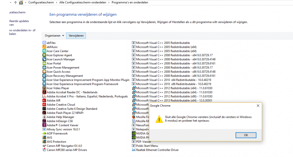 hoi Abb bedankt voor je feedback. .iets wat eenvoudig zou zijn en normaal gezien wel lukt, komt een foutmelding( WIndows 10) stap1: : bookmarks ok! stap 2: error bij Chrome verwijderen: start- configuratiescherm-programma's verwijderen -Chrome- en geen enkel scherm open en dan foutmelding; wat is windows 8 modus scherm? ik ga alvast op zoek in Windows maar als je enig idee hebt, welkom