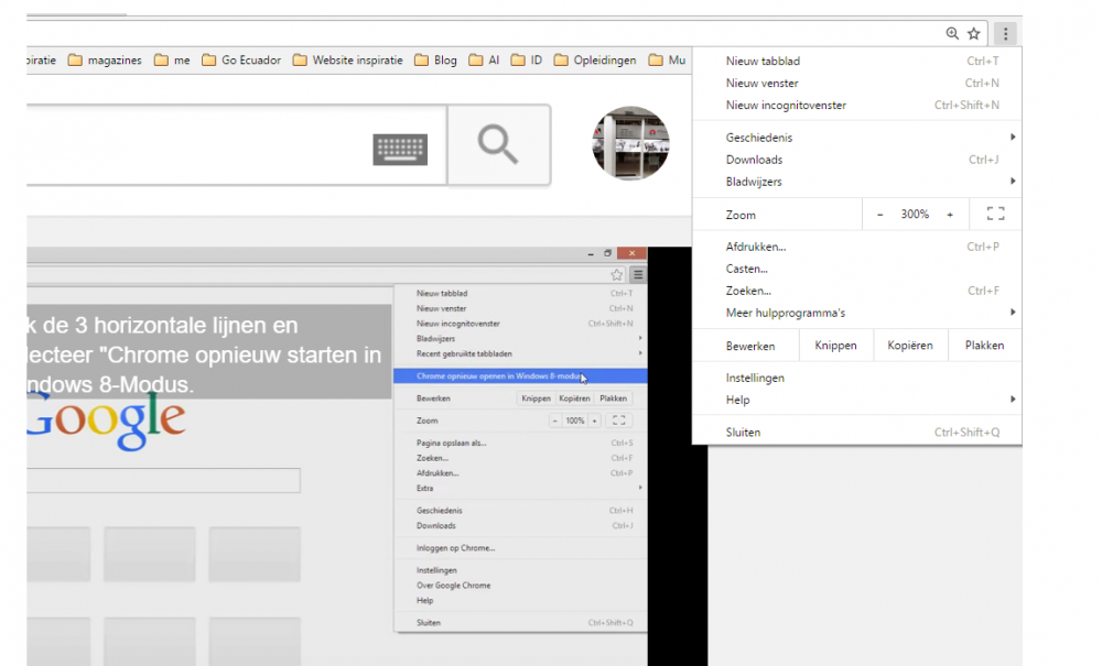 hoi Abbs, op het menu komt dit niet tevoorschijn en ben gaan spieken op het Google forum of er nog mensen zijn en dit gevonden: "Thanks for your question and we’d like to clarify on the confusion. To help simplify the Chrome codebase, we no longer offer Windows 8 mode (aka Metro mode) after Chrome version 49. We appreciate your past support for Metro mode. Please feel free to provide us with any feedback about the removal of Metro mode here as we’re collecting feedback to send directly to our team. Best, Kameron Chrome Community Manager" https://productforums.google.com/forum/#!msg/chrome/44StwlC3Gz0/av9QW2e0DQAJ Thomas, Did you enabled hardware acceleration?Windows 8 mode works only in Hardware accelerated machines. Go to Chrome menu > Settings > Show advanced settings > Under System category > check Use hardware acceleration when available. dat heb ik nageken in geavanceerde instellingen en staat niet aangevinkt. Dus ik heb Windows 10 met Chrome Versie 53.0.2785.89 m (64-bit) krijg een foutmelding over Windows 8 modus en het komt niet in de lijst voor, typisch Windows grrr Heb je enig idee? Ik ga alvast ook wat verder zoeken en alle tips zijn welkom:-)