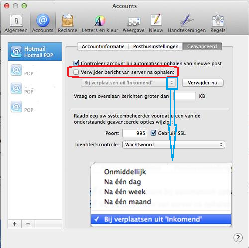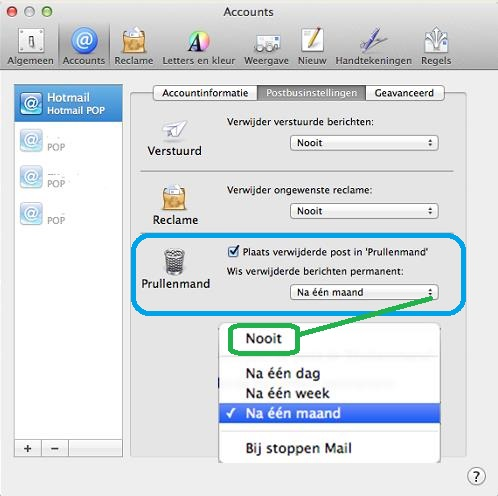 @ Morfie, Ik gebruik geen thunderbird en weet niet welke provider je gebruikt voor jouw e-mail. Tevens weet ik ook niet hoe je de fout kunt herstellen. Mijn vraag is: waarom je Mail van Apple –die standaard aanwezig is bij iMac- niet gebruik? [at]hotmail[dot]com, [at]gmail[dot]com en/of [at]isp[dot]nl en/of [dot]be kun je toevoegen bij Mail. Met Mail kunt je een aantal zaken zelf instellen. Activeer Mail vanuit de Dock en ga bij Mail in de menubalk naar Voorkeuren. Ga nu naar het tabblad Accounts >> tabblad Geavanceerd Hier kun je instellen wat en hoe met je e-mailberichten moet gebeuren. Plaats je een vinkje bij Verwijder bericht van server na ophalen dan zal het ook zo gebeuren, afhankelijk van je keuze. Ga nu naar het tabblad Accounts >> tabblad Postbusinstellingen, hier kun je instellen dat de mails die je in het prullenmand hebt geplaatst niet meteen worden verwijderd. -