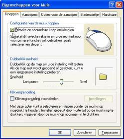 Muis voor linkshandigen Voor linkshandigen is het gebruik van de muis soms lastig. Ze zijn standaard ingesteld op rechtshandig gebruik. Klikken en dubbelklikken gebeurt met de linker muisknop, ook de primaire muisknop genoemd, en het zogenaamde rechtsklikken gebeurt met de secundaire muisknop oftewel de rechter muisknop. Gelukkig kunt u de werking van de muisknoppen gemakkelijk wijzigen: 1. Kies Start >> Configuratiescherm >> Printers en andere hardware. 2. Klik op het pictogram Muis. 3. Zet het vakje bij Primaire en secundaire knop omwisselen aan. 4. Klik op OK om het venster te sluiten. Sluit ook het Configuratiescherm. De muisknoppen werken nu precies andersom.