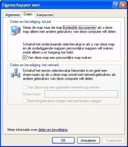 Persoonlijke mappen ls u uw computer met anderen deelt en niet wilt dat zij in uw mappen kunnen komen, dan dient u deze mappen in te stellen als Persoonlijke mappen. Dat doet u als volgt: 1. Selecteer de map met de naam van uw account in de map \Documents and Settings op de systeemschijf van uw PC. 2. Klik met de rechter muisknop op de map en selecteer in het getoonde snelmenu de optie Eigenschappen. 3. Selecteer in het dialoogvenster Eigenschappen voor <mapnaam> het tabblad Delen. 4. Vink in het tabblad Delen onder Delen en beveiliging lokaal de optie Van deze map een persoonlijke map maken aan. 5. Klik op OK.