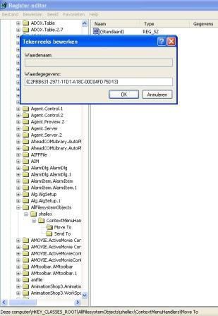 Naar map verplaatsen ls men in Mijn Computer rechts op een bestand klikt, dan krijgt men een snelmenu te zien met onder andere de optie Kopiëren naar. Wij gaan daar met behulp van een ingreep in het Windows Register de optie Naar map verplaatsen aan toevoegen. Maak altijd eerst een herstelpunt voordat u wijzigingen in het Windows Register gaat aanbrengen. Handel daarna als volgt: 1. Kies Start >> Uitvoeren. 2. Typ in het dialoogvenster Uitvoeren de opdracht regedit en klik op OK. 3. Kies in de Register-editor HKEY_CLASSES_ROOT >> AllFilesystemObjects >> shellex >> ContextMenuHandlers. 4. Rechtsklik op ContextMenuHandlers en kies in het getoonde snelmenu Nieuw >> Sleutel. 5. Geef de naam Move To in. 6. Rechtsklik in het rechter scherm op Standaard en kies in het snelmenu de optie Wijzigen. 7. Geef in het dialoogvenster Tekenreeks wijzigen in het vak Waardegegevens de volgende waarde in {C2FBB631-2971-11D1-A18C-00C04FD75D13} en klik op OK. 8. Sluit de Register-editor. Voortaan verschijnt nu ook de optie Naar map verplaatsen... in het snelmenu. Door deze optie te kiezen verschijnt er een dialoogvenster Items verplaatsen en kunt u een map kiezen of aanmaken waar u het desbetreffende bestand naar toe wilt verplaatsen.