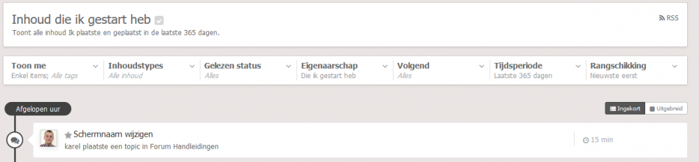 Hoe vind ik mijn geplaatste berichten terug? Heb je onlangs een vraag gesteld op PC Helpforum maar kan je het niet meteen terugvinden? Of wil je snel kijken of er reeds iemand gereageerd heeft? Tip: Directe link naar deze optie Alle inhoud die je zelf gestart hebt ? (maximum 1 jaar) 1. log in op PC Helpforum. 2. kies in de navigatiebalk 'Activiteit' en kies de knop 'Inhoud die ik gestart heb'. 3. het overzicht zal getoond worden van alle activiteit op de onderwerpen die je zelf hebt gestart. Hier kan je dus ook eenvoudig zien of er iemand reeds een reactie plaatste. Wil je een compacte weergave of liever iets uitgebreider? Gebruik de knoppen Ingekort en Uitgebreid. Alle geplaatste berichten zien ? (maximum 1 jaar) Wil je ook de berichten zien die je in andere topics hebt geplaatst, ga dan als volgt te werk: 1. kies in de navigatiebalk "Activiteit" en daarin de knop "Mijn activiteiten streams" i.p.v. "Inhoud die ik gestart heb". Daar kan je dan kiezen voor "Inhoud die ik geplaatst heb". Dan krijg je een overzicht van alle geplaatste berichten. Voor beide methodes is de tijdslimiet ingesteld op 365 dagen. Dit betekent dat je in deze lijst enkel de topics of berichten van het laatste jaar kan zien. En dit enkel als je onder de hoofding "Tijdsperiode" kiest voor de optie "ALTIJD". Alle topics die je gestart hebt of topics waarin je berichten hebt geplaatst ? (ook ouder dan 1 jaar). In beide bovenstaande gevallen, kan je maximum alle berichten terugvinden die geplaatst werden tijdens het voorbije jaar. Wil je echter berichten terugvinden die ouder zijn dan deze periode, kan je gebruikmaken van de optie "Specifiek datumbereik" onder de hoofding "Tijdsperiode". Daarbij dient een begindatum én een einddatum ingevuld te worden. Dit is echter minder handig indien je geen idee hebt van de periode waarin je een topic geplaatst hebt. Er is echter een methode waarbij je ALLE topics en berichten kan terugvinden, ook al zijn deze langer dan een jaar geleden geplaatst. En dat kan via de profielafbeelding. Wanneer je ingelogd bent op PC Helpforum, zie je bovenaan je inlognaam en je profielafbeelding (ook wel "avatar" genoemd). Wanneer je toevallig al in een topic aan het lezen bent (waarin je zelf gereageerd hebt), is ook daar deze profielafbeelding beschikbaar. Klik (in beide gevallen) op deze profielafbeelding. Dan kom je terecht op de profielpagina van je account. Om een overzicht te krijgen van ALLE berichten die je ooit geplaatst hebt (sinds je lid bent geworden van PC Helpforum), klik je op de button "Bekijk mijn activiteit". Wil je nog een onderscheid maken tussen de topics die je zelf gestart hebt en de topics waarin je berichten hebt geplaatst, dan kan dit in de linkerkolom. Voor de topics klik je op deze functie: Voor de berichten klik je op deze functie: