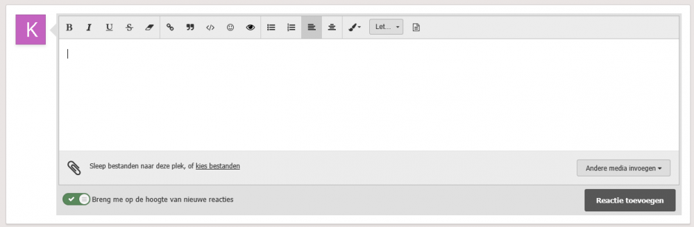 Hoe post ik een antwoord? In de discussie die je bekijkt, klik je onderaan na het laatste bericht in de met zwart omrandde kader. en dan krijg je dit. Je kan nu je reactie intikken en als je klaar bent, klik je op reactie toevoegen. Je kan hier ook een afbeelding of een ander bestand toevoegen aan je bericht. Hoe je hiervoor te werk gaat, kan je lezen in deze handleiding.