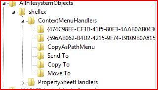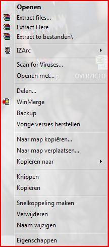 13. Standaard zijn deze opties niet zichtbaar normaal gezien en een bepaald programma zal deze toegevoegd hebben. Controleer even het volgende: 1. Kies Start >> Uitvoeren. 2. Typ in het dialoogvenster Uitvoeren de opdracht regedit en klik op OK. 3. Kies in de Register-editor HKEY_CLASSES_ROOT >> AllFilesystemObjects >> shellex >> ContextMenuHandlers. bekijk nu de onderstaande figuur. kijk even na of bij jou ook 'copy to' en 'move to' er staan indien deze er beide staan, klik je rechts en kies je verwijderen. We gaan ze nu opnieuw toevoegen zodat ze normaal gezien nu in de juiste volgorde verschijnen: Naar map verplaatsen 1. Kies Start >> Uitvoeren. 2. Typ in het dialoogvenster Uitvoeren de opdracht regedit en klik op OK. 3. Kies in de Register-editor HKEY_CLASSES_ROOT >> AllFilesystemObjects >> shellex >> ContextMenuHandlers. 4. Rechtsklik op ContextMenuHandlers en kies in het getoonde snelmenu Nieuw >> Sleutel. 5. Geef de naam Move To in. 6. Rechtsklik in het rechter scherm op Standaard en kies in het snelmenu de optie Wijzigen. 7. Geef in het dialoogvenster Tekenreeks wijzigen in het vak Waardegegevens de volgende waarde in {C2FBB631-2971-11D1-A18C-00C04FD75D13} en klik op OK. Naar map kopieren 1. Kies Start >> Uitvoeren. 2. Typ in het dialoogvenster Uitvoeren de opdracht regedit en klik op OK. 3. Kies in de Register-editor HKEY_CLASSES_ROOT >> AllFilesystemObjects >> shellex >> ContextMenuHandlers. 4. Rechtsklik op ContextMenuHandlers en kies in het getoonde snelmenu Nieuw >> Sleutel. 5. Geef de naam Copy To in. 6. Rechtsklik in het rechter scherm op Standaard en kies in het snelmenu de optie Wijzigen. 7. Geef in het dialoogvenster Tekenreeks wijzigen in het vak Waardegegevens de volgende waarde in {C2FBB630-2971-11D1-A18C-00C04FD75D13} en klik op OK. 8. Sluit de Register-editor. Kijk nu even na of deze nu goed staan. Zie figuur 2 groeten karel