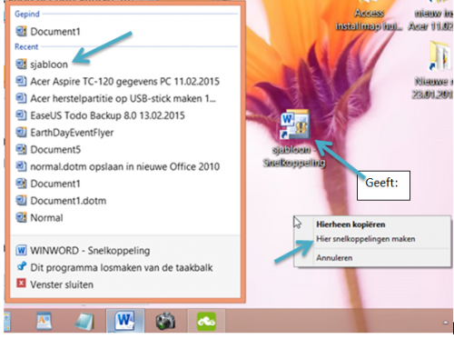 Clarkie, Ik heb via uw link https://support.offi...e5-36704932b9fe de daarin vermelde volgende link geopend: https://support.office.com/nl-nl/article/Een-nieuwe-sjabloon-maken-Word-2010-cb17846d-ecec-49d4-82ea-a6f5e3e8b9ae#__toc278287930 en daar was gelukkig wel veel uitleg te vinden. (Wel voor Win 7, Vista en zelfs nog XP maar nog niet voor 8.1 ) Maar voor zover mogelijk heb ik de te volgen weg voortgezet, doch na klikken op “openen” van Word was het weer het origineel van Word. Dan in een zoveelste poging (het houdt ons jong, nietwaar?☺) heb ik niet vanuit de snelkoppeling vanop het bureaublad, maar door het klikken met de rechtermuisknop op het Word-icoon onderaan de taakbalk en op “sjabloon” en dit met de rechtermuisknop naar rechts gesleept op het bureaublad en dan op “snelkoppeling” geklikt. En nu staat het gewenste sjabloon op mijn bureaublad en bij het aanklikken verschijnt het zoals ik het graag heb. Zie bijlage a.u.b. Misschien en hoogst waarschijnlijk niet conform de geijkte regels van toepassing volgens Windows…maar het werkt. Meer moet dan niet zijn voor een leek. Vriendelijk dank voor alles!