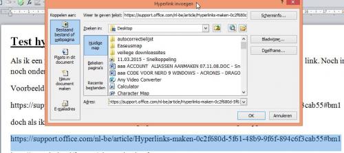 Als ik een url kopieer en deze als link in een Word-document plak, dan verschijnt die niet als link. Noch in het blauw, noch onderlijnd zoals het normaal is. Erop klikken om te openen werkt ook niet. Voorbeeld: https://support.office.com/nl-be/article/Hyperlinks-maken-0c2f680d-5f61-48b9-9f6f-894c6f3cab55#bm1 Doch als ik er nu met de rechtermuisknop op klik en de link markeer en dan in het venster op "Hyperlink" en op de blauw gemarkeerde balk klik, verschijnt onderstaand venster en dan klikken op OK en de zwarte link wordt normaal in blauw omgezet en onderstreept weergegeven en kan nu wel geopend worden als link. zie printscreen a.u.b. geeft dan: https://support.office.com/nl-be/article/Hyperlinks-maken-0c2f680d-5f61-48b9-9f6f-894c6f3cab55#bm1... maar is wel lastig werken omdat zo bij elke link te moeten doen. Bestaande links in oudere documenten verschijnen normaal en laten zich ook normaal openen bij elke link. ik heb de DVD Office 2010 Proff. laten "herstellen" alsook C: \ sfc-/scannow doch zonder resultaat. Graag een oplossing a.u.b. Daar ik met een nieuwe PC werk heb ik o.a. Microsoft Office 2010 terug nieuw moeten installeren en eveneens de autocorrectielijst in Access overgebracht. Deze werkt nu (na lang zoeken om die terug in gebruik te kunnen nemen...)gelukkig als voorheen. In Word zelf ben ik niet geweest. Ook de woordenlijst (Custom.dic) in Word ongemoeid gelaten. Geef ik maar mee als extra info, want een foutje is natuurlijk vlug gemaakt. Maar waar en hoe... -