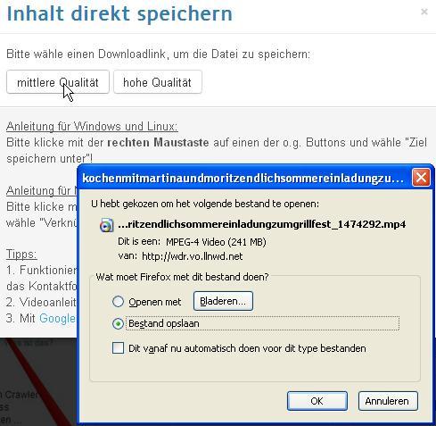 Vooreerst mijn excuses voor het niet eerder reageren,, maar ik wachtte tot de eerstvolgende video om te downloaden. De eerste (“Kochen mit Käse, Quark und Co”) verliep prima! Nu maandag, 28.05.2013, wou ik het zelfde doen met de uitzending van vrijdag 24.05.2013, doch bij Datei speicheren” gaf hij de mededeling: “Forbidden...You don't have permission to access /CMS2010/mdb/14/149880/kochenmitmartinaundmoritz_1474292.mp4 on this server” Dan twee dagen gewacht omdat ik dacht misschien te vlug te zijn daar er mogelijk met het weekend tussen, vrijdag en direct daarop maandag, de website nog niet was aangepast. Doch ook nu woensdag krijg ik hetzelfde bericht te lezen: “Forbidden...You don't have permission to access /CMS2010/mdb/14/149880/kochenmitmartinaundmoritz_1474292.mp4 on this server ” Waarom me het de vorige keer lukte en nu weer niet, is me een raadsel. Ik geef de laatste mail te lezen waarin je zien kunt dat alles conform de regels verloopt en me de mogelijkheid wordt aangeboden om legaal te downloaden. Wel nog zeggen dat de vorige uitzendingen zonder problemen kunnen gedownload worden naar de werkwijze zoals je me via de link eerder al doorgaf. Als je nu de moed opgeeft kan ik dat best begrijpen. Ik krijg er ook een punthoofd van. De laatste tijd zijn er meermaals wijzigingen aangebracht op hun website waardoor ik vermoed dat ze zelf door de bomen het bos niet meer zien. Ik kan je dan alleen maar waarderen voor het geduld en de tijd dat je aan me besteedde waarvoor oprechte dank. Met vriendelijke groeten,