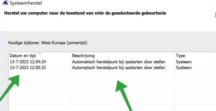 een backup zal je dan niet hebben (da's nochtans altijd handig: in dit geval zou je er na een half uurtje vanaf geweest zijn) - die moet je zelf manueel maken (of manueel instellen) Start > typ herstelpuntµ- Je krijgt een popupschermpje met daarin rechts: Systeemherstel. Klik daarop en dat geeft dan weer "systeembestanden en systeeminstellingen terugzetten Daar ga je naar Volgende en dat geeft iets als dit: in dit voorbeeld (en neen, ik ben Stefan niet ) heeft het systeem twee herstelpunten die je mogelijk terug kan zetten. Staan er bij jou van voor die datum, dan kan je die laten terugzetten en ben je het normaal gesproken kwijt