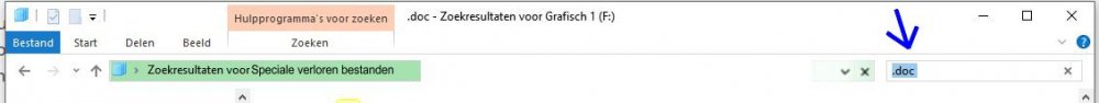Kijk dus gewoon in de mappen Speciale verloren bestanden en meer verloren bestanden Zoek daarin naar bestanden die eindigen op .doc - .docx (= Wordbestanden) .xls of .xlsx (exellbestanden) txt (tekstbestanden) of .pdf (pdf's) Het kan haast niet dan dat je er moet vinden. Hoe doe je het? 1. selecteer de map Speciale verloren bestanden (je krijgt dan die tekst die in het groene gedeelte staat die je bevestigt dat je inderdaad in die map gaat zoeken 2. in het veld rechts vul je in .doc (vanaf je het invult gaat de computer al zoeken) 3. dat groene balkje wordt groter naarmate het zoeken loopt 4. Daaronder krijg je dan een lijst met bestanden die gevonden worden. 5. worden bestanden gevonden > selecteer ze àllemaal en kopieer ze naar de map Recover Doe dit dan voor de rest: docx, xls, xlsx, txt, pdf (en ook voor jpg, zou ik je aanraden) -