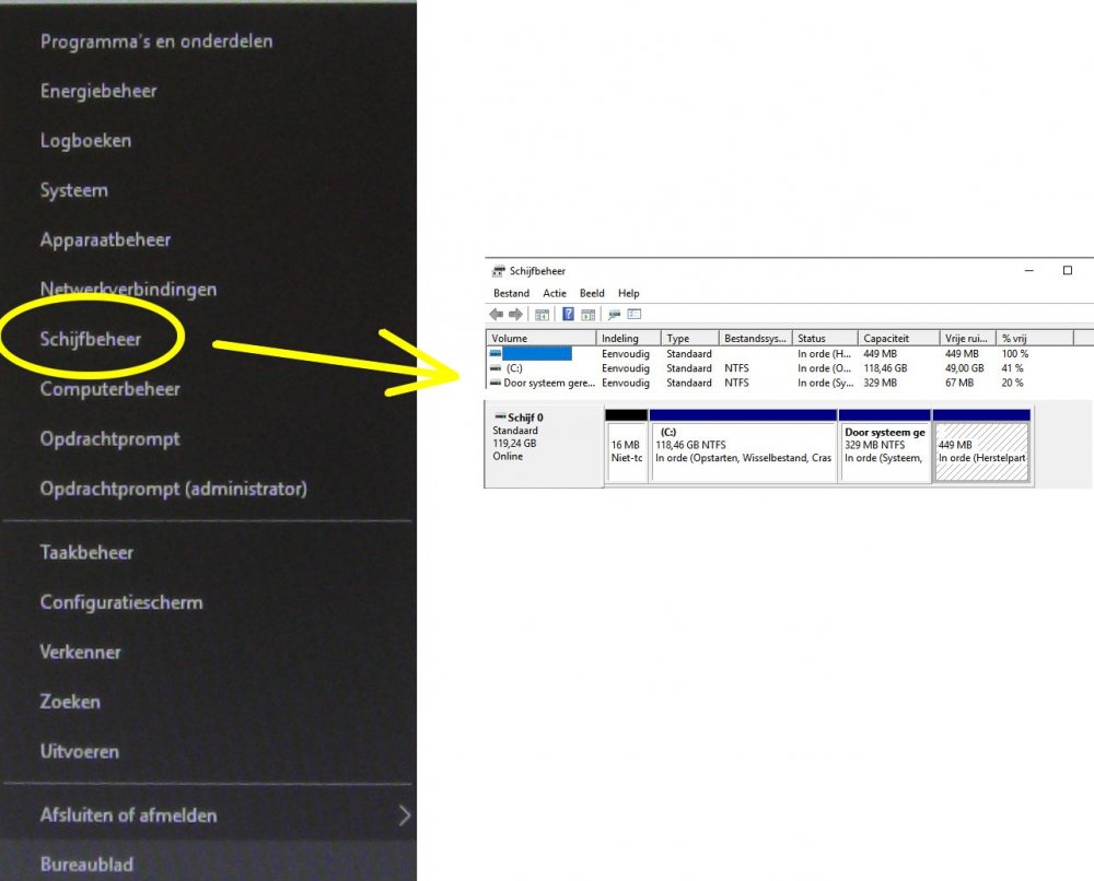 Die ESP: da's een probleem voor later. Eerst wil ik weten hoe je schijven eruit zien. (tussen haakjes: een schijf kan je verdelen in verschillende partities (onderdelen) die ook elk een 'schijf'letter krijgen. Zo heb ik één van mijn schijven die bestaat uit 5 verschillende partities: D,E,F,G en H - dit LIJKEN aparte schijven, maar het zijn eigenlijk maar een soort afgebakende delen van één en dezelfde schijf. Vooraleer we verder kunnen wil ik dus weten of de 'schijven' waar jij van praat ook schijven zijn ofwel partities - en dus wil ik er een screenshotje van. (hetgeen jij plaatste is niet wat ik wilde) Ik toon je even de weg met een plaatje omdat ik de termen in het Frans niet ken, maar zo'n rèchterplaatje zou ik willen zien: (klik dus eerst rèchts op je windowsknop, dan krijg je de keuzes die je hier links ziet) -