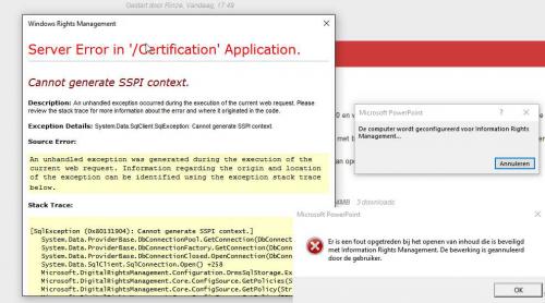 Rinze, (welkom op PCH) een foutmelding die ik ook nog nooit tegenkwam, en dus probeerde ik je ppsx te openen en kreeg al dadelijk dit: en dus blijkbaar begon windows aan het configureren van die information rights (wat het ook is ) - maar dit lukte blijkbaar niet. Mogelijk ben je geholpen met volgende linken: http://answers.microsoft.com/en-us/office/forum/office_2007-word/server-error-in-certification-application/131e97c1-c94d-4897-b946-6f3671587d69/?auth=1 https://social.technet.microsoft.com/Forums/office/en-US/c62b84ca-afe0-4f7a-8dc3-874ae7187e46/regarding-microsoft-office-power-point-presentation?forum=officeitproprevious (in de laatste is sprake van: gebruikte jij mogelijk Microsoft Information Rights Management (IRM) om je presentatie te beveiligen? - want daar spreekt men ook van een bepaalde dienst die ermee gestopt is... ?