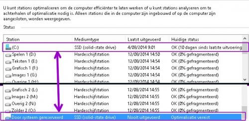 Dank voor de link Asus! (en: uitgevoerd !) Toch een bijkomende vraag: als ik naar het punt defragmenteren ga, krijg ik twee verschillende zaken te zien van mijn C (SSD) : euh... wat is het nu: wordt ze nu wèl of niet gedefragmenteerd... (wat betekent '10 dagen na laatste uitvoering' ? ? ?) -