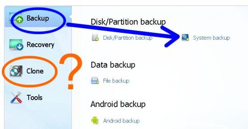 'k heb het programma sinds kort in gebruik en al eenmaal een kloon teruggeplaatst - zonder problemen. Alleen: ik wilde net een nieuwe 'kloon' maken en merk net het volgende op: tot hiertoe deed ik het met de eerste optie (blauw) maar plots merkte ik als derde optie Kloon op (oranje) - euh: wat is het verschil tussen beide?