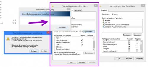 Ik begon te twijfelen of het wel zoals mijn probleem was, maar gezien je laatste antwoord denk ik toch van wel. De blauwe melding: gaat die over deze account (want blijkbaar - als ik het goed kan afleiden - is dat de account 'Iedereen' ? Je eigen account (rechts) lijkt me goed ingesteld te staan en dus vind ik het raar dat je het niet kan: toen ik daar alles aanvinkte waren mijn problemen opgelost. Tenzij - tenzij - jij aanlogt met die Iedereen-account, want diè heeft te weinig rechten. Dus kom ik uit bij de vraag: als 'wie' log jij in ? en om op je tweede vraag te antwoorden: ja, dat (copy-paste) is natuurlijk ook een oplossing, maar de bovenste gaat makkelijker en sneller. Je kan natuurlijk ook rechts klikken op een map, ze in het verkenner-venster naar een lege plaats slepen en kiezen voor Hier Kopieren - dan testen of je er mee kan werken en dan de origenele map gaan wissen - maar da's dus met een omweg...