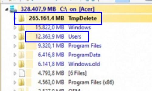 Wat me opvalt: twee dingen: Bovenaan: die TMPdelete-map is immens groot - het 'tmp' wijst me in de richting van temporary-map en als het inderdaad dàt betekent, mag die hele map in de prullenbak en heb je al dadelijk een boel plaats meer. Daarom zou ik zetten: maak een kloon van je schijf (of heb je die nog liggen, gezien je de laptop pas onlangs kocht) en wis dan die map. (je kan , nog veiliger, ze gewoon gaan hernoemen door gewoon een paar letters aan de naam toe te voegen - dan kan je normaal makkelijk terug. - voor het geval dit toch problemen zou geven raad ik je dus aan van een kloon (ghost, image,...) bij de hand te houden. en dan daar onder: die users-map van jou is ook heel groot - staan er geen 'oude' users bij van vorig gebruiker? Maar wat me ook doet opkijken: je windows-map is maar een goeie 15 Gig groot - nu ja: 'groot' ? Klein dus - wat voor Windows heb je?