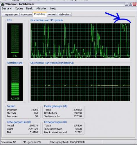 Heeft het zin een nieuwe processor te steken?Passer reageerde op Passer's topic in Archief Hardware algemeen Superjona: dank voor je antwoord - en zo iets vreesde ik ook al. (met 'vervangen' bedoelde ik wel: een sterkere steken - maar ook dat zal met zo'n oud systeem niet te doen zijn vrees ik) Jean-Pierre: dit is een momentopname van gedurende het opstarten van mijn Grafisch programma (blauwe pijl) - hij bevroor evenwel op dat moment niet, maar je krijgt er een idee van. De vorige pieken : geen idee van op welk moment dit gebeurde. Is het dit wat je bedoelde of had je het proces-venster willen zien? (ook jij dank voor je aandacht voor mijn vraag)