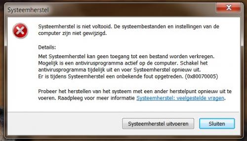 Ik heb nogmaals een systeemherstel proberen te doen om te proberen of daarna nog een systeemherstel zou kunnen doen naar een eerder moment (weet niet of dit mogelijk is?) maar dan krijg ik na het opnieuw opstarten deze melding. Heb het nog een keer geprobeerd met mijn antivirus uit (als het goed is) maar dan krijg ik nog steeds dezelfde melding. -