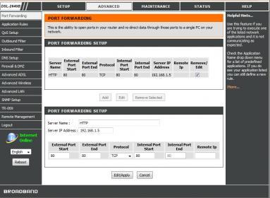 Ik heb een dlink DSL-2640B router, met volgende firmware: EU_4.00 Hardware Version: B2. Ik had nu graag, vnc en xampp via m'n publiek adres kunnen bereiken. Maar dit wil maar niet lukken, time out. Hier heb je de handleiding: ftp://ftp.dlink.se/Products/dsl-products/dsl-2640b/Documentation/DSL-2640B_Manual_v10.pdf pagina 37, maar het probleem is ongeveer dat sinds de firmware upgradede is, de userface helemaal op de schop is genomen. Dus ook Default Port Forwarding on the Dlink DSL-2640B klopt niet meer. Voor vnc is 5900 en 5800 (via browser) belangrijk en voor xampp poort 80. Ik heb dit al gebruikt om te kijken of de poort is of niet: PortForward.com - Free Help Setting up Your Router or Firewall en nog een paar tooltjes, die zeggen telkens je checkt iets anders (recheable, port open). Bij vnc bestaat er ook een site om te checken: VNC Network Test De vnc versie: Het gaat om de trial van 30 dagen. VNC Server Enterprise Edition E4.5.3 (r39012) Build on Apr 9 2010 at 16:09:29 32-bit unicode