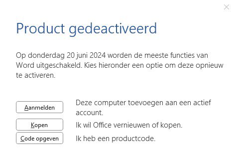 Mijn zoon heeft een actief Office 365 Family abonnement dat hij deelt met mij. Ik mag dus Office 365 installeren op maximum 5 apparaten. Op één van mijn PC's (de RK4L9AV) waarop Office 365 geactiveerd was kreeg ik al enige tijd melding dat ik mij opnieuw moest aanmelden alvorens ik bestanden kon bewerken of bewaren (saven). Er stond dan bv. in Excel of Word een naast mijn naam rechtsboven in de header. Na opnieuw aanmelden verdween die waarschuwing en werkte alles weer normaal. Sinds deze week verdwijnt de waarschuwing echter niet meer na inloggen. En sinds gisteren verschijnt bij openen van bv. Word of Excel de melding "Aanmelden verplicht" en "Product gedeactiveerd". Herhaalde pogingen tot aanmelden verandert hier echter niets aan. Wanneer ik inlog op mijn Microsoft account zie ik inderdaad mijn abonnement op Microsoft 365 Family staan en wanneer ik klik op "Apparaten" zie ik de 4 PC's die ik regelmatig gebruik. Ik heb geprobeerd Microsoft 365 Family opnieuw te installeren op apparaat RK4L9AV vanaf mijn Microsoft account, maar dat heeft geen verandering opgeleverd. Wie kan mij op weg helpen?