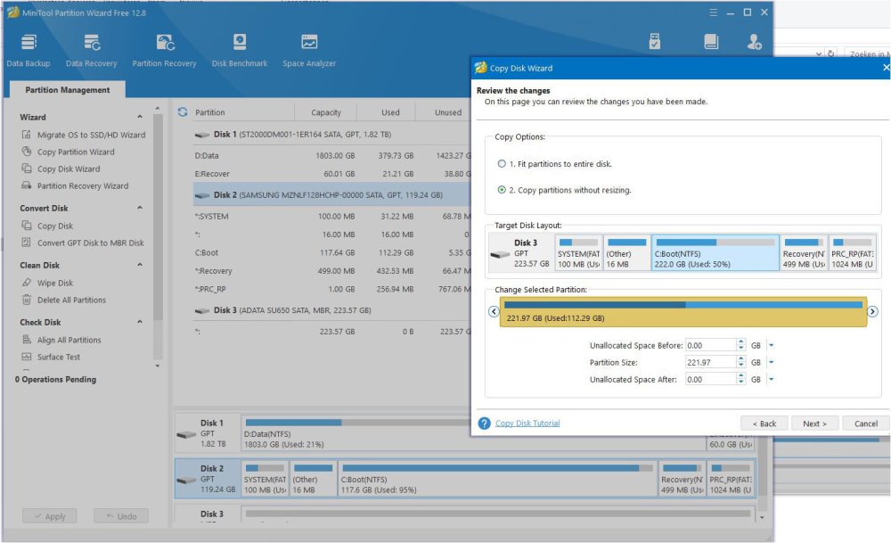 Nee hoor, maar even wat andere dingen moeten doen Ik ben echter op een probleem gelopen bij het gebruik van de MiniTool Partition Wizard. Ik heb alle stappen gevolgd van de YouTube video. Maar bij de laatste stap, wanneer ik op Finish klik wordt mij gevraagd het programma aan te kopen. Ik heb toch wel de free version gebruikt (zie afbeelding)?