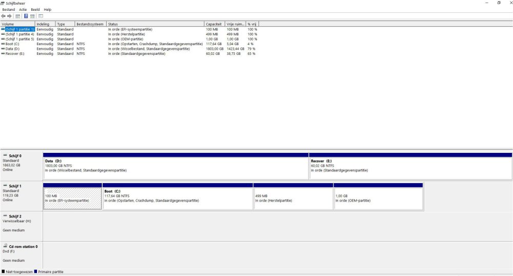 Dit is wat ik zie als ik Verkenner open: De nieuwe SSD is nu automatisch hernoemd naar de C-drive (en ik vermoed dat het Windows logo dat erbij staat aanduidt dat dit de echte "opstart"-schijf is). De oorspronkelijke SSD van 128 GB werd automatisch hernoemd naar "Boot (G:)". Mogelijk omdat "het systeem" herkent dat daar bepaalde (opstart) bestanden op staan? Voor mij geen probleem hoor. Of is er een goede reden om de naam te wijzigen? Zoja, hoe? In schijfbeheer zie ik het volgende: