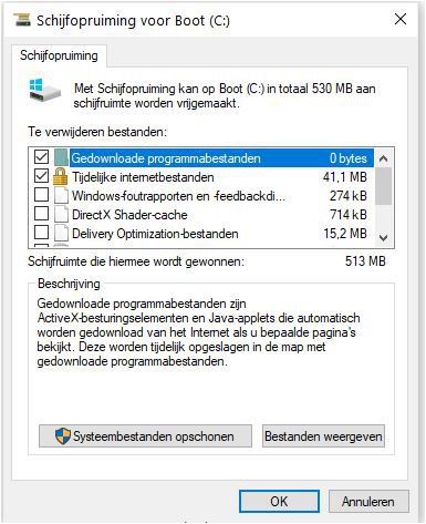Ik heb op "systeembestanden opschonen" geklikt. Hieronder het resultaat: Als ik de twee bovenste categorieën aanvink kom ik al aan 3.13 GB, wat al een goed begin is. Als ik alles aanvink kom ik aan 3.2 GB. Graag bevestiging dat ik echt alles mag verwijderen. Heb ik dan nog herstelpunten e.d.?