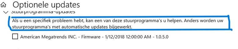 Bij Windows Update - optionele updates vind ik volgend overzicht van Stuurprogramma updates: Welke hiervan is de BIOS update? En welke is versie 02.20.00? Of zou het kunnen dat de door u voorgestelde update voor een andere computer (HP?) is? De computer waar het nu over gaat is een Multimedia-pc MEDION® AKOYA® P2120 D (MD 8836). Bij het opstarten geeft de PC in BIOS aan dat de geïnstalleerde versie 11OEMWOX.101 is van 11/20/2015 (zie afbeelding in vorige post). De MEDION ondersteuningswebsite geeft als BIOS update ECS H110H4EM V1.x aan: Hoe kan ik zien welke de recentste is? Ik begrijp de codering van die updates niet goed (sorry). Waarom toch specifieke (optionele) updates doen als Windows zelf zegt (zie kader) dat stuurprogramma's automatisch worden bijgewerkt, tenzij men specifieke problemen heeft (die ik niet heb voor zover ik weet)?