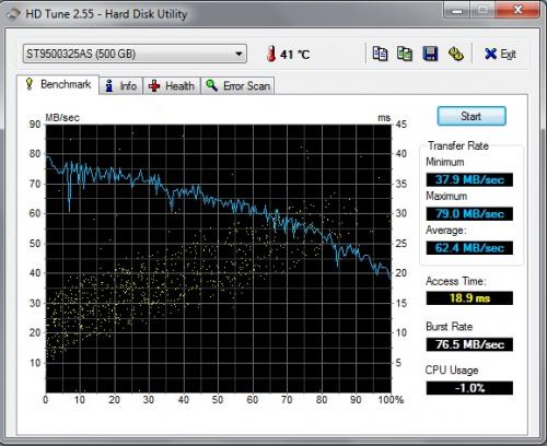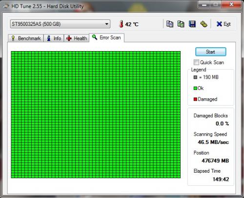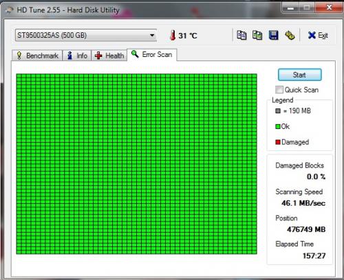 Hallo, Ik heb al maandenlang het probleem dat mijn laptop vastloopt. Als de muis hapert, loopt de laptop een paar seconden erna vast. Meestal krijg ik een zwart scherm, maar ook soms een paars scherm met een wit, groot vierkant waar mijn computermuis stond. Ik heb nog maar 1 keer Bluescreen gehad, en toen startte mijn laptop automatisch terug op. Maar als ik een zwart of een paars scherm krijg, moet ik hem uitzetten door lang op de aan- en uitknop te drukken. Ik heb mijn laptop ook al in een computerwinkel binnengebracht, en ze vonden geen oorzaak. Ze denken "Slijtage". En ik heb (een hele tijd geleden) mijn laptop's harde schijf getest en dit was het resultaat: Weet er iemand een oplossing?