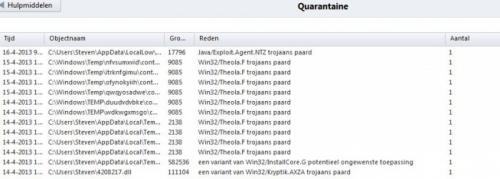 nog even een extra vraagje: is het de bedoeling dat ik bestanden die door eset nod32 in quarantaine zijn geplaatst 'verwijder uit quarantaine'? Ik wil natuurlijk die bestanden verwijderen, maar 'uit quarantaine verwijderen' klinkt als vrijlaten. - - - Updated - - - ik heb ook even nog een smart scan laten maken en die 'variant van Win32/TrojanDownloader etc" is er nog steeds - - - Updated - - - ik heb ze verwijderd en dit waren ze: -