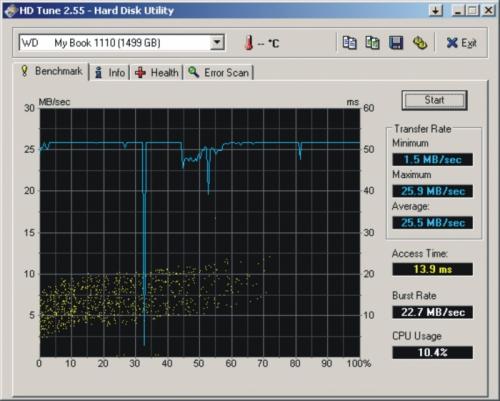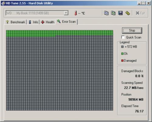 Externe harde schijf gaf melding "fout bij het schrijven naar......."aadC&C reageerde op aadC&C's topic in Archief Hardware algemeen De USB connector is gerepareerd en de drive wordt nu gescand op errors. Electronisch gezien is er dus weer contact. De scan heeft ongeveer 100Gb gescand zonder errors te vinden. Dat zijn natuurlijk de fysieke errors, niet de data. De ellende is begonnen met die connector denk ik. Hier een printscreen van de benchmark van hd-tune: Wat mij hier opvalt (en verontrust) is de plotselinge "dip" in de transfer rate. Later nog eens wat "gerommel". Ik deed absoluut helemaal niets op mijn PC. (Ik had al eens een eerder stukje gezien waarin de benchmark duidelijk be-invloed werd door een programma opstarten, bijvoorbeeld. Hier de diskscan tot nu toe: Er is nog even te gaan voor we alles weten.