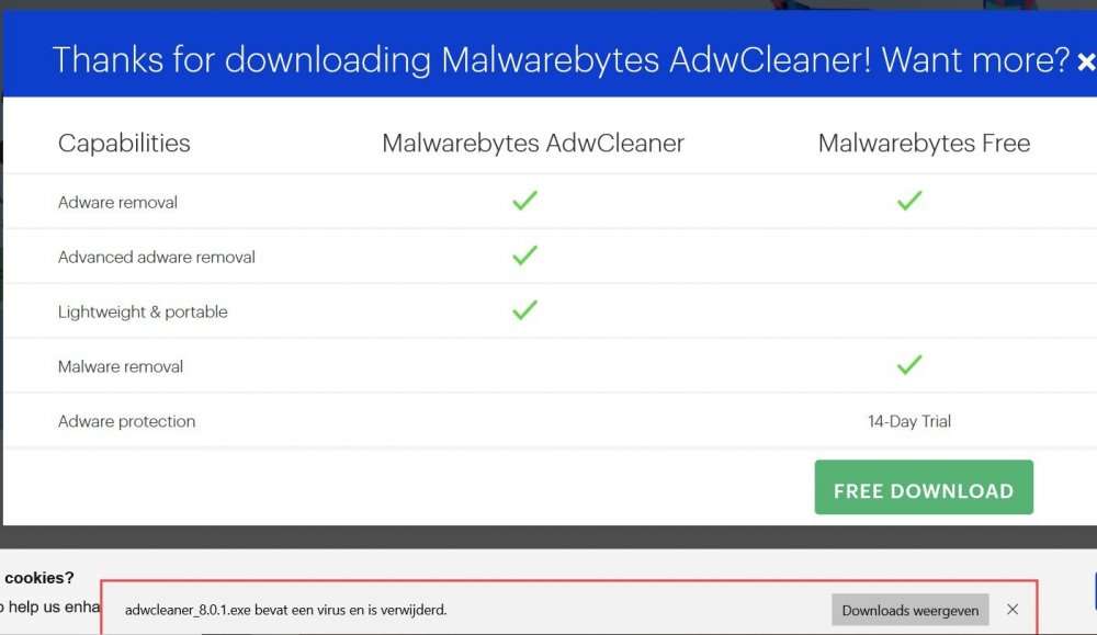 abbs, Ik ben er vanuit gegaan dat ik fafx64 moest gebruiken en niet de fafx86 ....ik heb het gedaan .exe aangevinkt, krijg de melding succesfully fixed, maar na het opnieuw opstarten en het op dezelfde manier downloaden van adware via jouw bericht......weer de melding adwcleaner_8.0.1.exe bevat een virus en is verwijderd. -