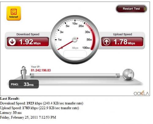 Bedankt Clarkie, ik heb de speedtest uitgevoerd en bijgevoegd. Maar waarom staat daar als IP adres "81.242.196.83" Is dat mijn IP-adres? Ik dacht van niet of ben ik mis, want ik ken er niet veel van. Wat leidt U af uit de speedtest? Ik kan goed surfen, maar heel traag downloaden! Groetjes en bedankjes vanMarcelleken