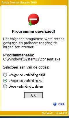 [ATTACH]9371[/ATTACH]Beste helper Clarkie, IK ben zo gelukkig dat je mij wil helpen ! Ik kreeg voor de 2e keer een bericht binnen C\Windows\System32\consent.exe Panda vraag mij deze verbinding te weigeren of toe te laten....Wat moet ik doen ? Misschien ligt het daar aan? Bijgevoegd de logfile van Hijack this Logfile of Trend Micro HijackThis v2.0.4 Scan saved at 1:37:32 PM, on 26-Feb-11 Platform: Windows 7 (WinNT 6.00.3504) MSIE: Internet Explorer v8.00 (8.00.7600.16722) Boot mode: Normal Running processes: C:\PROGRAM FILES (X86)\PANDA SECURITY\PANDA INTERNET SECURITY 2010\WebProxy.exe C:\Program Files (x86)\CaptureWiz\Pro\CaptureWiz.exe C:\Program Files (x86)\NewTech Infosystems\Packard Bell MyBackup\BackupManagerTray.exe C:\Program Files (x86)\Panda Security\Panda Internet Security 2010\avciman.exe C:\Program Files (x86)\Panda Security\Panda Internet Security 2010\ApVxdWin.exe C:\Program Files (x86)\Mozilla Firefox\firefox.exe C:\Program Files (x86)\Panda Security\Panda Internet Security 2010\PavBckPT.exe C:\Program Files (x86)\Mozilla Firefox\plugin-container.exe C:\Program Files (x86)\Microsoft Office\Office12\OUTLOOK.EXE C:\Program Files (x86)\Trend Micro\HiJackThis\HiJackThis.exe C:\Windows\SysWOW64\NOTEPAD.EXE R1 - HKCU\Software\Microsoft\Internet Explorer\Main,Search Bar = Preserve R0 - HKCU\Software\Microsoft\Internet Explorer\Main,Start Page = http://www.google.be/ R1 - HKLM\Software\Microsoft\Internet Explorer\Main,Default_Page_URL = http://homepage.packardbell.com/rdr.aspx?b=ACPW&l=0409&m=easynote_lj71&r=27360310a555l0464z185f4492u496 R1 - HKLM\Software\Microsoft\Internet Explorer\Main,Default_Search_URL = http://go.microsoft.com/fwlink/?LinkId=54896 R1 - HKLM\Software\Microsoft\Internet Explorer\Main,Search Page = http://go.microsoft.com/fwlink/?LinkId=54896 R0 - HKLM\Software\Microsoft\Internet Explorer\Search,SearchAssistant = R0 - HKLM\Software\Microsoft\Internet Explorer\Search,CustomizeSearch = R3 - URLSearchHook: (no name) - {1392b8d2-5c05-419f-a8f6-b9f15a596612} - (no file) O2 - BHO: AcroIEHelperStub - {18DF081C-E8AD-4283-A596-FA578C2EBDC3} - C:\Program Files (x86)\Common Files\Adobe\Acrobat\ActiveX\AcroIEHelperShim.dll O2 - BHO: Groove GFS Browser Helper - {72853161-30C5-4D22-B7F9-0BBC1D38A37E} - C:\Program Files (x86)\Microsoft Office\Office12\GrooveShellExtensions.dll O2 - BHO: Aanmeldhulp voor Windows Live ID - {9030D464-4C02-4ABF-8ECC-5164760863C6} - C:\Program Files (x86)\Common Files\Microsoft Shared\Windows Live\WindowsLiveLogin.dll O2 - BHO: Java Plug-In 2 SSV Helper - {DBC80044-A445-435b-BC74-9C25C1C588A9} - C:\Program Files (x86)\Java\jre6\bin\jp2ssv.dll O3 - Toolbar: (no name) - {1392b8d2-5c05-419f-a8f6-b9f15a596612} - (no file) O3 - Toolbar: (no name) - {30F9B915-B755-4826-820B-08FBA6BD249D} - (no file) O4 - HKLM\..\Run: [backupManagerTray] "C:\Program Files (x86)\NewTech Infosystems\Packard Bell MyBackup\BackupManagerTray.exe" -h -k O4 - HKLM\..\Run: [LManager] C:\Program Files (x86)\Launch Manager\LManager.exe O4 - HKLM\..\Run: [GrooveMonitor] "C:\Program Files (x86)\Microsoft Office\Office12\GrooveMonitor.exe" O4 - HKLM\..\Run: [NBKeyScan] "C:\Program Files (x86)\Nero\Nero8\Nero BackItUp\NBKeyScan.exe" O4 - HKLM\..\Run: [APVXDWIN] "C:\Program Files (x86)\Panda Security\Panda Internet Security 2010\APVXDWIN.EXE" /s O4 - HKLM\..\Run: [sCANINICIO] "C:\Program Files (x86)\Panda Security\Panda Internet Security 2010\Inicio.exe" O4 - Startup: CaptureWiz.lnk = C:\Program Files (x86)\CaptureWiz\Pro\CaptureWiz.exe O8 - Extra context menu item: Add to Google Photos Screensa&ver - res://C:\Windows\system32\GPhotos.scr/200 O8 - Extra context menu item: Free YouTube Download - C:\Users\Chris\AppData\Roaming\DVDVideoSoftIEHelpers\youtubedownload.htm O9 - Extra button: @C:\Program Files (x86)\Windows Live\Writer\WindowsLiveWriterShortcuts.dll,-1004 - {219C3416-8CB2-491a-A3C7-D9FCDDC9D600} - C:\Program Files (x86)\Windows Live\Writer\WriterBrowserExtension.dll O9 - Extra 'Tools' menuitem: @C:\Program Files (x86)\Windows Live\Writer\WindowsLiveWriterShortcuts.dll,-1003 - {219C3416-8CB2-491a-A3C7-D9FCDDC9D600} - C:\Program Files (x86)\Windows Live\Writer\WriterBrowserExtension.dll O9 - Extra button: Send to OneNote - {2670000A-7350-4f3c-8081-5663EE0C6C49} - C:\PROGRA~2\MICROS~1\Office12\ONBttnIE.dll O9 - Extra 'Tools' menuitem: S&end to OneNote - {2670000A-7350-4f3c-8081-5663EE0C6C49} - C:\PROGRA~2\MICROS~1\Office12\ONBttnIE.dll O9 - Extra button: Research - {92780B25-18CC-41C8-B9BE-3C9C571A8263} - C:\PROGRA~2\MICROS~1\Office12\REFIEBAR.DLL O10 - Unknown file in Winsock LSP: c:\program files (x86)\common files\microsoft shared\windows live\wlidnsp.dll O10 - Unknown file in Winsock LSP: c:\program files (x86)\common files\microsoft shared\windows live\wlidnsp.dll O15 - Trusted Zone: http://gratis-software-centrum.clubs.nl O15 - Trusted Zone: http://www.nieuwsblad.be O16 - DPF: {3860DD98-0549-4D50-AA72-5D17D200EE10} (Windows Live OneCare safety scanner control) - http://cdn.scan.onecare.live.com/resource/download/scanner/en-us/wlscctrl2.cab O16 - DPF: {5D637FAD-E202-48D1-8F18-5B9C459BD1E3} (Image Uploader Control) - http://belgacom.extrafilm.be/ImageUploader5.cab O16 - DPF: {D27CDB6E-AE6D-11CF-96B8-444553540000} (Shockwave Flash Object) - http://fpdownload2.macromedia.com/get/shockwave/cabs/flash/swflash.cab O18 - Protocol: grooveLocalGWS - {88FED34C-F0CA-4636-A375-3CB6248B04CD} - C:\Program Files (x86)\Microsoft Office\Office12\GrooveSystemServices.dll O18 - Protocol: wlpg - {E43EF6CD-A37A-4A9B-9E6F-83F89B8E6324} - C:\Program Files (x86)\Windows Live\Photo Gallery\AlbumDownloadProtocolHandler.dll O23 - Service: Adobe Active File Monitor V7 (AdobeActiveFileMonitor7.0) - Adobe Systems Incorporated - c:\Program Files (x86)\Adobe\Photoshop Elements 7.0\PhotoshopElementsFileAgent.exe O23 - Service: @%SystemRoot%\system32\Alg.exe,-112 (ALG) - Unknown owner - C:\Windows\System32\alg.exe (file missing) O23 - Service: AMD External Events Utility - Unknown owner - C:\Windows\syste