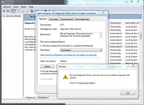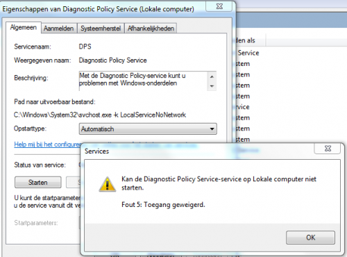 Hoi, ik heb problemen om service diagnostics policy gestart te krijgen. Wat ik tot nu toe gedaan heb: - via services.msc naar diagnostics policy gegaan, en bij eigenschappen gecontroleerd wat opstarttype is. Dit is automatisch. Klik op starten, toepassen, OK. Services worden niet gestart. Krijg nu Fout 5 toegang geweigerd. - cmd als administrator uitgevoerd. Vervolgens net localgroup Administrators /add networkservice [Enter] en net localgroup Administrators /add localservice [Enter] uitgevoerd. Pc opnieuw gestart. Nogmaals de service proberen te herstarten. Helaas werk dit niet. Dezelfde foutmelding komt terug. - ook de optie om via regedit de sleutel HKEY_LOCAL_MACHINE\SYSTEM\CurrentControlSet\Services\DPS\Parameters de TrustedInstaller de rechten Volledig beheer en Lezen te geven, werkt. Na een herstart, krijg ik de specifieke services niet aan de praat. Ik heb hulp nodig, wie heeft advies en kan mij verder helpen. Is het nu tijd voor HJT ?
