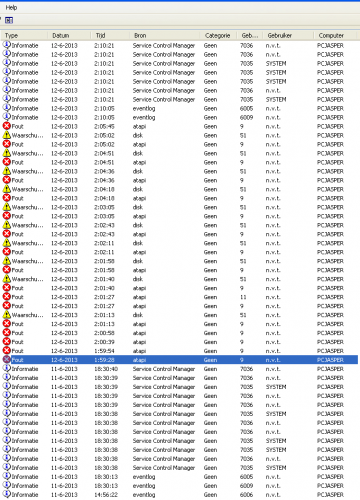 Ahum, ik heb net weer het probleem gehad rond een uur of 10 en ik heb de pc toen afgezet. Na een half uur was ik terug op mijn kamer en heb ik de SATA kabel van de HDD in een andere slot van het moederbord gedaan (ook een master-slot). Toen ik de pc toen opstartte, bleef de pc haken op het Logo scherm van Windows 7 en begon Eindows met een foutencontrole (CHKDSK) van de C boot partitie van de schijf (waarop Windows staat). Hij had hier een aantal dingen gerepareerd en toen startte de PC opnieuw op. Dit keer bleef hij weer haken op het Windows 7 logo scherm en maakte de HDD rare geluiden. Na ongeveer 5-10 minuten op dit scherm te zitten kreeg ik een BSOD: UNMOUNTABLE_BOOT_VOLUME. STOP 0x000000ED (0xFFFFFA8004912060, 0xFFFFFFFFc000000E, 0x0000000000000000, 0x0000000000000000) en moest ik de pc uitzetten. Ik heb toen opnieuw de SATA kabel uit het moederbord gehaald en terug in de nieuwe slot gestoken (dus dezelfde als tijdens de STOP error). Daarna bootte de PC in één stuk normaal Windows 7 in, zei dat er nieuwe drivers geïnstalleerd waren voor de HDD en vroeg om een PC restart. Dit heb ik toen gedaan en alles bootte weer in één keer zonder problemen door. Toen heb ik de Combofix.exe gerund en daarna gezocht naar de BSOD en CHKDSK foutencontrole logs, maar deze kon ik niet vinden... Misschien had ik de SATA kabel er eerst niet goed in gedaan? In ieder geval vervelend en geeft mij weer het idee dat er toch iets mis is met de hardware. Ik moet bekennen dat ik nog niet geprobeerd heb om de SATA kabel in een andere SATA slot te doen, wel heb ik de SATA kabel al vervangen een keer. Dan in reactie op kape voor de combofix: -