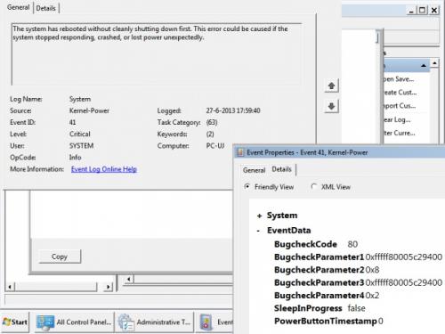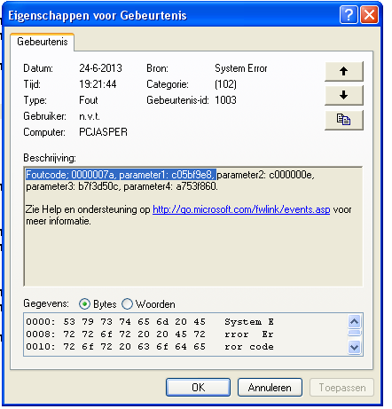 Beste PC HelpForum, De laatste maand zit ik met een probleem en ik kan de essentie niet direct plaatsen. Ik vermoed dat het om een hardware probleem gaat, maar dit weet ik niet zeker (HDD, moederbord of PSU?). Ik heb namelijk geen extra moederbord, PSU of HDD en een nieuwe kopen wil ik eigenlijk doen als ik zeker weet wat het probleem is. Beschrijving van de hardware: Moederbord: Asus P5K Pro uit 2008 GPU: NVIDIA GeForce 8800GT 512 MB Processor: Intel Core 2 Duo E8400, Overclocked naar 3,60 GHz (FSB: 400 MHz, 9x multiplier) Power unit: CoolerMaster 620W PSU (details ben ik even kwijt..) Geheugen: 4x DDR2 1GB, 2x Kingston (801 MHz; DIMM; CL5;KVR800D2N5/1G), 2x Corsair (801 MHz; DIMM; CL5; XMS2; CM2X1024-6400). NOOT: kan de precieze KVR en CM2X namen misschien fout hebben. Komt erop neer dat ze allebei 1GB zijn, een 5(-5-5-18?) latency hadden en 801 MHz zijn (door overclock van FSB naar net iets boven 400). Hard-disk: Western Digital Caviar Black WD5002aalx, 7200 RPM, 32-bit, 500 GB, 3,5'', SATA-3 600 Mbps DVD-station: Optiarc DVD RW AD 7200S ATA Floppy Drive: 3,5'' iets uit een oude pc, altijd gewerkt. Operating System: Windows 7 SP1 64-bit en hiervoor Windows XP SP3 32-bit. Steeds 2 partities, 1 voor Windows, 1 voor data. Beschrijving van de essentie van het probleem: Mijn PC heeft de afgelopen maand het probleem dat het scherm/OS na lang aanstaan (5-10 uur) begint te bevriezen. De OS en elke full-screen applicatie reageert spontaan vaak een 30-60 tal seconden nergens meer op (bevriest), na deze korte stop kan ik vaak 1-5 seconden iets doen en dan begint de computer weer te bevriezen voor een 30-60 tal seconden en kan ik vaak daarna weer kort iets doen. Dit blijft altijd lang doorgaan (nog nooit meegemaakt dat het niet stopte) en er komt soms een BSOD na heel lang wachten (na 15+ keer de cyclus van bevriezen, iets doen, bevriezen), er komen daarnaast nooit andere grafische, processor of andere errors in beeld en ik kan de muis en het toetsenbord tijdens de bevriezingen gewoon bewegen/gebruiken (al dan niet met een heel lange vertraging totdat de tekst of de klik geaccepteerd wordt door de OS/applicatie). Ik moet de pc vaak handmatig uitzetten (of als de pc nog een beetje reageert, de OS afsluiten) om het probleem te resetten. Als ik dit doe start de PC gewoon in 1x door zonder problemen naar de het ingelogde scherm van de OS, maar het is wel zo dat de PC dan vaak vervolgens meteen weer doorgaat met de bevries-cyclus, zodat ik niets kan. Wat helpt is om de SPANNING van de voeding er af te halen na het uitzetten van de PC en de PC een tijdje laten staan (1 min+, afkoelen?), dan doet de OS het vaak weer prima voor enige tijd. De PC heeft verder nergens last van en doet het prima in de eerste paar uren van een "nieuwe" dag. Verder detail beschrijving van de geschiedenis van het probleem: Ongeveer een maand geleden begon mijn computer het beschreven probleem te vertonen. Toentertijd gebruikte ik nog Windows XP SP3 met alle updates. Het allereerste wat ik toen gedaan heb is de computer scannen op malware/spyware met behulp van AVG 2013 Free Antivirus, Windows defender en Kaspersky TDSKiller, ook had ik CCleaner gerunt. Dit hielp niet en ik heb toen een Memtestx86+ 4.20 gerund voor een uur of 8 (overnacht), hier kwamen geen problemen uit en de pc had de test aan één stuk door uitgevoerd (11 controles, 11 pass, 0 errors). Daarna heb ik Prime95 gerund voor 100% load van CPU's en had ik de temperatuur van de CPU gemonitord. Dit heb ik voor ongeveer 2-3 uur gedaan en de CPU's bleven stabiel en de maximale temperatuur die gehaald werd onder 100% load was 68/70 graden celsius voor de twee cores (Via RealTemp). Tegelijkertijd hiermee ben ik in de EventViewer gaan kijken en kwam ik het volgende tegen dat overeenstemde met het tijdstip van de problemen: Ik heb toen wat gegoogeld naar de atapi.sys errors in de eventviewer en een systeemherstel gedaan naar een punt dat een week eerder was. Het probleem bleef... toen heb ik via Speedfan de harde schijf SMART data bekeken (97% fit, geen problemen) en heb ik daarna de Harde Schijf gedefragmenteerd met Auslogics Diskdefrag. Daarna heb ik de harde schijf op fouten gecontroleerd met behulp van het windows-commando CHKDSK /r /f (opnieuw opstarten), hierbij werden er enkele fouten gevonden en gecorrigeerd (vooral index fouten?, log niet meer opgeslagen). Het probleem bleef zich echter voordoen en hierna heb ik alle SYSTEEMherstel punten verwijderd en de pagefile opnieuw ingesteld (gezet naar 0, terug naar 4 GB daarna). Het probleem bleef nog altijd, en ik heb toen de DVD-rom en floppy drive ontkoppeld en uit de pc gehaald. Uiteraard bleef het probleem nog altijd en hierna heb ik de stuurprogramma's voor de IDE controllers in Windows XP opnieuw ingesteld naar de Standaard IDE controllers. Ook dit hielp niet en heb ik opnieuw mijn pc gescanned via windows defender, AVG, CCleaner en TDSKiller, weer niets gevonden. Ik heb toen via de windows XP CD de MBR (master boot record) hersteld naar standaard en opnieuw een foutencontrole van de HDD uitgevoerd met CHKDSK /r /f. Dit keer vond de PC niets aan errors. Tijdens het gebruik van de PC kreeg ik tijdens het bevries-cyclus één keer een BSOD met het volgende bericht: KERNEL_DATA_INPAGE_ERROR STOP 0x0000007A Op dit moment ben ik begonnen met het volledig formatteren van de HDD om Windows 7 Professional 64-bit SP1 (via de KULeuven) te installeren. Dit is met succes gebeurd en ik toen de standaard updates, software (Avast! antivirus, Microsoft Office 2010, Skype, Java Runtime, Firefoxe etc.) en drivers (nvidia, realtek audio, muis etc.) geïnstalleerd. Zover ging het toen 2 dagen goed zonder problemen, ik moet wel bekennen dat mijn PC toen vaak niet langer aanstond dan 4 uur aan één stuk (drukke tijd en vaak updates installen en dan restarten). Ik heb toen de hyberfile.sys verwijderd door hibernation uit te zetten en ik had de 4 GB pagefile.sys verhuisd naar de partitie waar niet windows 7 zelf opstond, maar wel de dat