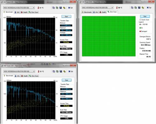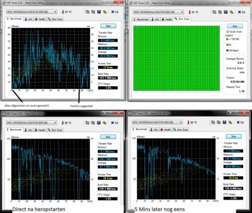 Daar ben ik weer. Wat laat deze keer, maar ik wilde kijken of mijn PC het kon volhouden. Helaas was dit niet het geval. Rond 3 uur vannacht begon de PC tijdens Skyrim weer af en toe te bevriezen. Allereerst wil ik opmerken dat ik sinds ik gister de SATA kabel in een andere slot van het moederbord gedaan heb en de combofix uitgevoerd heb, de pc sneller lijkt op te starten (44 seconden van boot BIOS piep-geluidje naar Windows 7 bureaublad en onmiddellijke reactie van aanklikken programma's, vroeger was dit 1 minuut en 10-20 seconden en ja ik heb een timer hier liggen). Ook lijkt het of de PC het iets langer volgehouden heeft voordat de problemen optraden dan hiervoor, nu om 3 uur vannacht pas begon ie problemen te vertonen (stond 9 uur aan, maar veel Skyrim gedaan wat vaak binnen 5-7 uur vroeger al problemen gaf). Daarnaast bleek dat ik dit keer tijdens het probleem alle programma's en applicaties relatief redelijk snel kon afsluiten en dat ik na een paar minuten wachten de PC heel voorzichtig kon gebruiken (1 programma ala firefox opstartte per minuut zeg maar), waardoor ik de HD tune heb kunnen laten draaien na de manifestatie van de bevriezing cyclussen (heb ook een quick scan gedaan voor errors). Ik heb hiervoor zoveel mogelijk programma's en services afgesloten met behulp van het Windows taakbeheer. Daarnaast heb ik toen na de eerste HD tune ook mijn PC uitgezet en herstart en verder niets anders gedaan dan HD tune gerund na opstarten. Hier is het resultaat van de HD tune: Een bijkomende opmerking is dat ik sinds vandaag terug mijn USB externe HDD heb aangesloten en deze werkt prima tijdens de bevries-cyclus, ik kan deze schijf in de Windows verkenner nagenoeg vlekkeloos bekijken en browsen, terwijl als ik dat met de interne Western Digital schijf dit doe tijdens het probleem, dit nauwelijks gaat of reageert. Ten slotte wil ik vermelden dat de spanningen in de bios hetzelfde zijn als de spanningen die hij aangeeft tijdens het opstarten van de PC op een "nieuwe dag" en dat de temperatuur van de HDD volgens HD tune gewoon 31 graden Celsius bedroeg tijdens de bevriezingscyclus. -