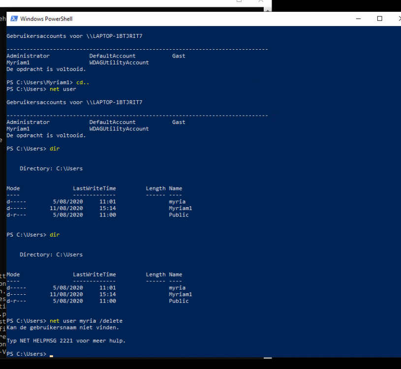 Hallo, ik heb een vervelend probleem ivm gebruikersaccount op een nieuwe laptop met Win10. Ik heb bij de 1e opstart een gebruiker aangemaakt (naam: MyriamH), gekoppeld aan een hotmailadres (zoals windows dat tegenwoordig wil). Vervolgens wou ik Windows laten opstarten zonder wachtwoord. Ik deed dit via de opdracht 'netplwiz' waarbij ik het vinkje afzette bij de tekst: 'Gebruikers moeten een gebruikersnaam en wachtwoord opgeven om deze computer te kunnen gebruiken'. Hier is het volgens mij verkeerd gegaan. Ik wou heropstarten om bovenstaande aanpassing te testen, en ik zag het account MyriamH maar ook een 2e account 'myria'. Standaard wil hij vanaf 'myria' opstarten maar daar lukt het niet om in te loggen (verkeerd ww). Geen idee hoe die 'myria' ontstaan is. Inloggen via MyriamH lukt wel. Nu wou ik van dit account 'myria' vanaf en heb hiervoor Windows Powershell gebruikt. Wsl stom van mij maar ik heb een nieuw account aangemaakt (Myriam1) en ik wou de 2 andere accounts verwijderen. MyriamH kon ik verwijderen, maar account myria lukt niet. Ik krijg de melding: 'kan de gebruikersnaam niet vinden' (zie printscreen in bijlage). Het vervelende is nu dat myria (waar ik niet in raak wegens geen ww) admin-rechten heeft en Myriam1 heeft beperkte rechten. Iemand een idee hoe ik dit kan recht trekken? Er staan nog geen gegevens op de laptop, dus geen probleem als er een account gewist moet worden. Bij de getoonde printscreen ben ik ingelogd onder Myriam1. Alvast bedankt voor tips.