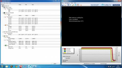 1. Hallo, ik heb een dell inspiron r se 7720 waar ik zeer tevreden van ben maar deze word te warm. De laptop haalt tijdens zware processen 75°c en zorgt hierdoor af en toe voor een totale freeze bij het gamen. Dingen die ik al gedaan heb om de temperatuur te drukken; - Externe Cooling fan aangekocht die met zen linker fan onder mijn cpu fan ligt. - Via de interne cooling fan luchtdruk reiniger gespoten in geval van stof. Deze 2 zaken hebben niets (amper 1°c) aan mijn temperatuur verranderd. Hebben jullie nog tips? In bijlage een screenshot van hw monitor met een 15 minuten stresstest. - - - Updated - - - Hier een iets duidelijkere screenshot https://docs.google.com/file/d/0B-WDmn5KnGaNMW9DMGU5YW1YRFE/edit?usp=sharing