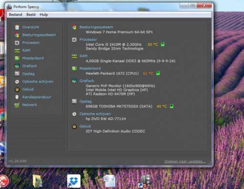 Beste, De intelcontrole wordt niet uitgevoerd, ook niet met ie en uitgeschakelde firewall. Ik krijg een foutmelding en dan een verwijzing naar een x.../java die ook niet uit te voeren is. Dan de specy uitgevoerd: beperkt dwz dll niet te verkrijgen. http://speccy.piriform.com/results/l0pHbJYupcAsjJ6vd8ZC6FC Verder een screenshot van de bestaande pc. mvg serjo -