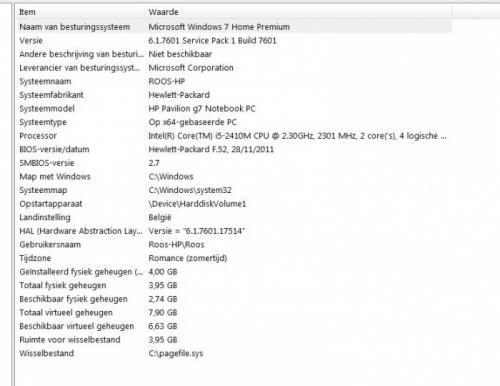 Beste, Ik ben al een beetje verder, dwz ik bezit de productspecificaties van het toestel: Hardware Software Hardware Productnaam g7-1150sb Productnummer QA531EA Microprocessor 2,3 GHz Intel Core i5-2410M Microprocessorcache 3 MB L3-cache Geheugen 4 GB DDR3 Maximaal... Het toestel meermaals opgestart in normale modus: - men vraagt een framedriver te installeren, gedownload, blauw scherm - meermaals dit uitgeprobeerd, echter zonder resultaat. Dwz ik ben niet in de mogelijkheid om het toestel te scannen op zijn eventueel ontbrekende drivers. Verder heb ik nog een systeemherstel doorgevoerd in veilige modus, maar ook daarna nog steeds een fysieke geheugendump. mvg Serjo -