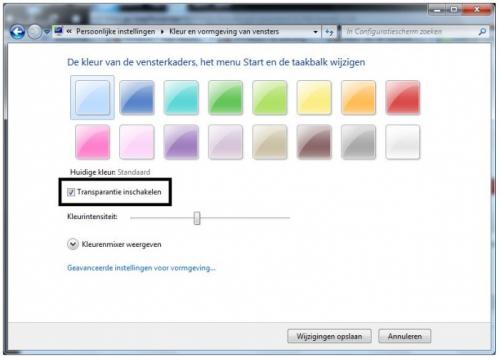 Indien de hierboven beschreven actie niet het gewenste resultaat heeft (dit is namelijk afhankelijk van de gebruikte bureaubladachtergrond), dan schakel je de transparantie uit, kies je bovenaan één van de aangeboden kleuren en regel je de gewenste intensiteit met de schuifbalk...bevestig de wijzigingen door onderaan op de knop Wijzigingen opslaan te klikken.