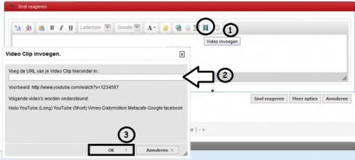 De knop staat links van het cirkeltje met het cijfer 1 in...wanneer je er op klikt opent er zich een venster waar je de URL van je video kan invoeren, zie het tekstveld links van de pijl naast de cirkel met het cijfer 2 in. Na het invoeren klik je op OK, zie de knop ter hoogte van het cirkeltje met het cijfer 3 in. Een andere optie is het gebruikmaken van onderstaande code, waar je dan de sterretjes vervangt door de URL van je video. [video]*******************[/video]