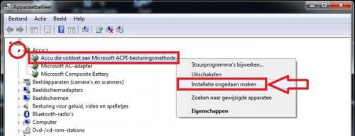 Dag bella, welkom op PCH. Is de gebruikte batterij een originele van Samsung of een compatibele ?... Sluit je laptop af, verwijder eerst de adapter en dan de batterij...start opnieuw op, zonder batterij maar enkel op netspanning. Klik op start (Windowsknop links onderaan) en geef in het zoekvenster onderaan apparaatbeheer in. In apparaatbeheer klik je op het driehoekje voor Accu's...klik met rechts op Accu die voldoet aan Microsoft ACPI-besturingsmethode... In het menu dat zich opent kies je voor installatie ongedaan maken, zie foto hier onder...let op : enkel uitvoeren voor Accu die voldoet aan Microsoft ACPI-besturingsmethode. Na deze handelingen sluit je de laptop af, verwijder je de adapter en plaats je de batterij terug in de laptop. Wanneer je de batterij hebt geplaatst sluit je de adapter opnieuw aan en verbind je de laptop met de netspanning. Start de laptop opnieuw op en kijk wat het resultaat is van deze handelingen.