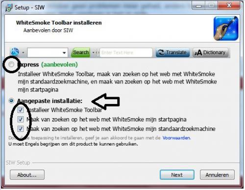 Kleine toelichting nog bij de installatie van SIW (System Information for Windows), zie bericht 14. Er wordt getracht om een toolbar (WhiteSmoke Toolbar) mee op je systeem te installeren en dergelijke aanbiedingen ben je beter kwijt dan rijk. Kies voor Aangepaste installatie ipv Express en haal de drie vinkjes weg alvorens je op Next klikt, zie afbeelding. De temperaturen vind je bij Hardware --> Sensoren.
