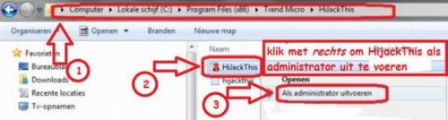 Ik ontving onderstaand privé-berichtje van william34: De instructie is opgebouwd in 3 delen...in elk deel vind je een link waarop je kan klikken: er zal zich een nieuwe pagina openen waar je meer info zal vinden. In deel 1 staat link naar de downloadlocatie van het programma HijackThis...in deel 2 staat een link naar een afbeelding: deze afbeelding verduidelijkt de instructie die er net boven staat, namelijk hoe je het programma kan uitvoeren als administrator. Tenslotte vind je in deel 3 de link naar de volledige handleiding...in deze handleiding kan je stap voor stap alle instructies bekijken: het downloaden en installeren van het programma, hoe je een logje produceert en hoe je het hier in je topic kan posten. Ik hoop dat deze toelichting wat licht in de duisternis heeft gebracht ?... ;-) -